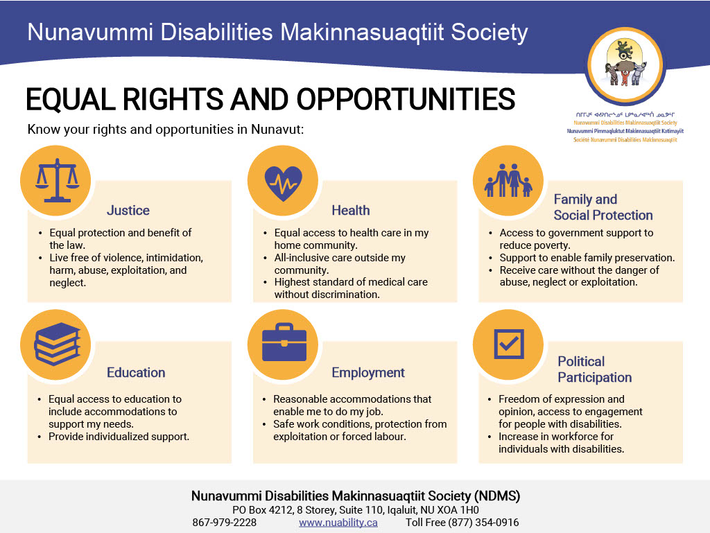 Infographic of equal rights and opportunities in Nunanvut: justice, health, family and social protection, education, employment, and political participation. Read article for full description.